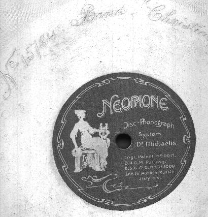 "Neophone records were made of papier mache, and were advertised as "warranted indestructible". To prove this, Dr. Michaelis would assemble a group of potential buyers at thc top of a four-storeyed building, then standing at the corner of Worship Street and the City Road, and demonstrate by throwing a record out of the open window to the street below. A boy then dashed down the stairs and retrieved the record. This was then played, and as it emitted its normal noises this was clear evidence that it was none the worse for its rough treatment. But although customers did not buy records to drop on the heads of unsuspecting pedestrians, yet all might have gone well had not the records, when displayed in shop windows, curled up in the sun and assumed pathetic surrealistic shapes. The records did not sell, the upshot of this was that many hundreds of recordings of military bands, banjo soloists, concertina players, and singers, both comic and serious, were made, but never heard."